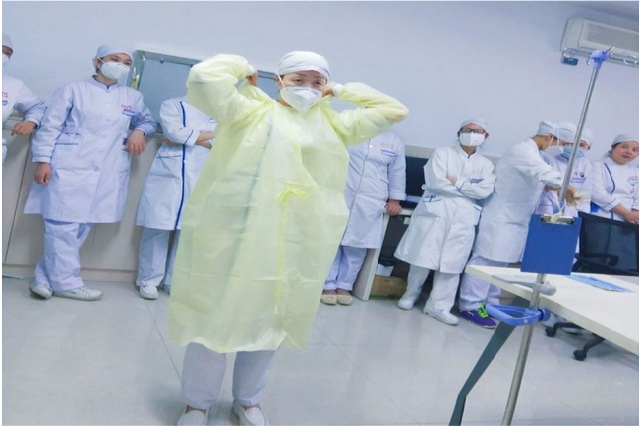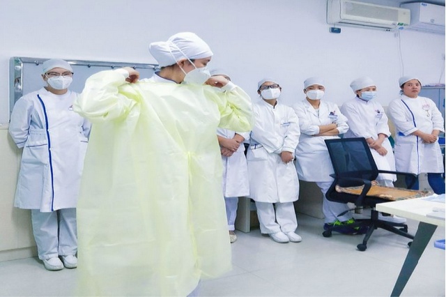 刘长利主任就以上几位护士的示范做了简单的点评及总结,并进一步在次详细讲解示范了隔离防护服的正确使用方法、重点强调了穿脱要点及有关无菌技术注意事项,最后董晓娟护士长就无菌带手套和隔离衣的穿脱技术进行培训,务必现场全体医务人员认真学习掌握,确保每项操作流程实施到位。