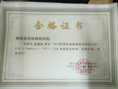 2018年8月25日,在陕西省医学会病理学会通报了2018年度全省免疫组织化学染色室间质评结果。我科以优异的成绩获得“2018年度免疫组化室间质评”合格证书。