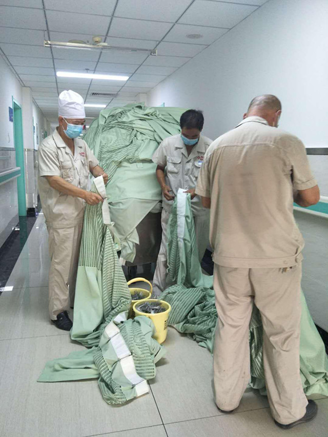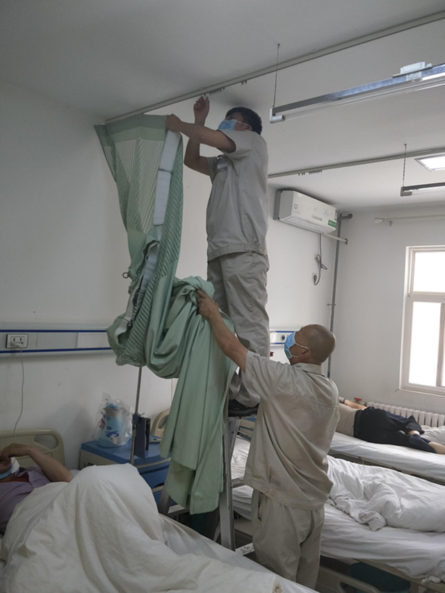2018年酷夏将近,为创建干净整洁的医院氛围,我院总务科对病区所有窗帘、隔帘进行了拆洗。