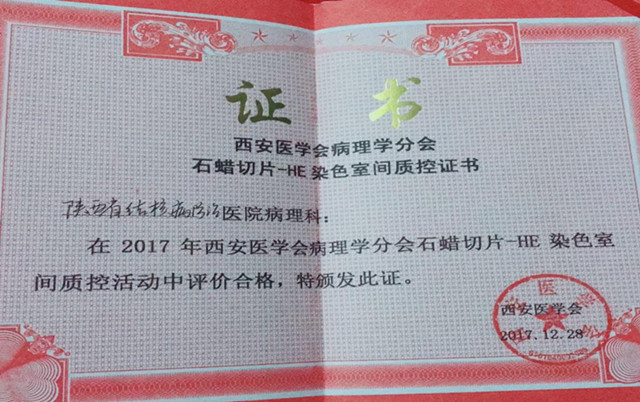 2018年1月13日,在西安医学会病理学分会第四届古都西安病理技术高峰论坛中,通报了常规切片HE染色室间质评结果,我科以优异成绩获得“2017年度常规切片HE染色室间”合格证书。