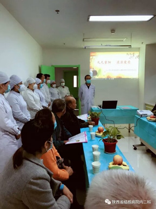 岁岁重阳,今又重阳,不是春光,胜似春光。在金风送爽、丹桂飘香的季节里,又迎来了我国传统的敬老节日"九九"重阳节,陕西省结核病院内二科召开"关爱老年患者座谈会",内二科全体医护人员和30余位患者及家属齐聚一堂,共承敬老美德。