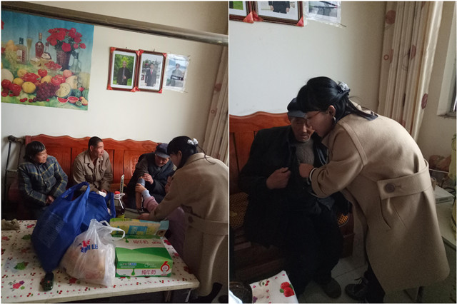 五、3月23日下午在仵倩红主任带领下,联合临潼区疾控的两名老师的一起,驱车前往距离县城30公里的临潼区土桥乡玉川村李湾组,看望我们科室去年年底出院的70岁患者杨叔叔,对他进行了家访与慰问,给他们赠送了大米、食用油、牛奶、面包及生活品,仵院主任详细询问了患者的病情并给他做了肺部的听诊,护士给他测了血压;并告诉他要坚持服药,定期复查,我们祝他早日康复。
