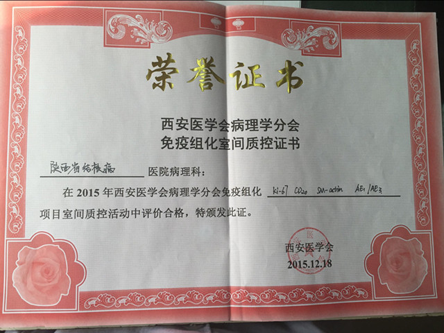 本次质控活动选用四种抗体,CD20,SMA,AE1/AE3 ,Ki67。我科接到通知后,严格按照相关质控要求,在规定时间内做好以上四种抗体的检测工作,12月中旬由西安医学会病理分会诊断学组专家对本次质控活动进行集体审阅,严格按照标准打分,对符合标准的参赛医院,给予颁发证书。