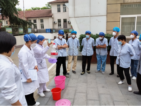 马曼曼老师详细讲解了84消毒液配制方法,要求按10mg/L浓度进行配制,针对保洁员普遍文化程度偏低,运用通俗易懂的方法进行演示,运用定量法,告诉保洁员5升水加50毫升84原液,10升水加100毫升84原液的方法进行配置,闫主任强调,需要消毒浸泡的抹布和拖布巾一定要先洗涤干净且拧干水分再浸泡30分钟,这样就不会稀释消毒液浓度,才能真正起到消毒作用。