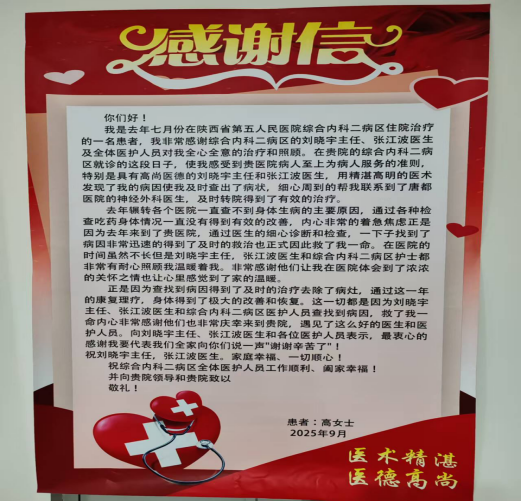 2025年9月7日,我院综合内科收到了一封来自长安区杜曲镇某村村民高女士的感谢信。信中,高女士深情回顾了去年在综合内科就诊的难忘经历。时间回到2024年7月6日,当时她长期被头晕、头痛困扰,辗转多家医院,做了多项检查并服用药物,症状却始终未见好转。经人介绍,她来到综合内科二病区求诊。