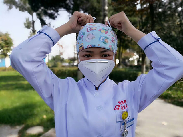 2.将口罩的上缘带子拉起,将口罩覆盖口鼻,上边的两条系带拉至耳后与头上系紧,不能系在耳朵上。
