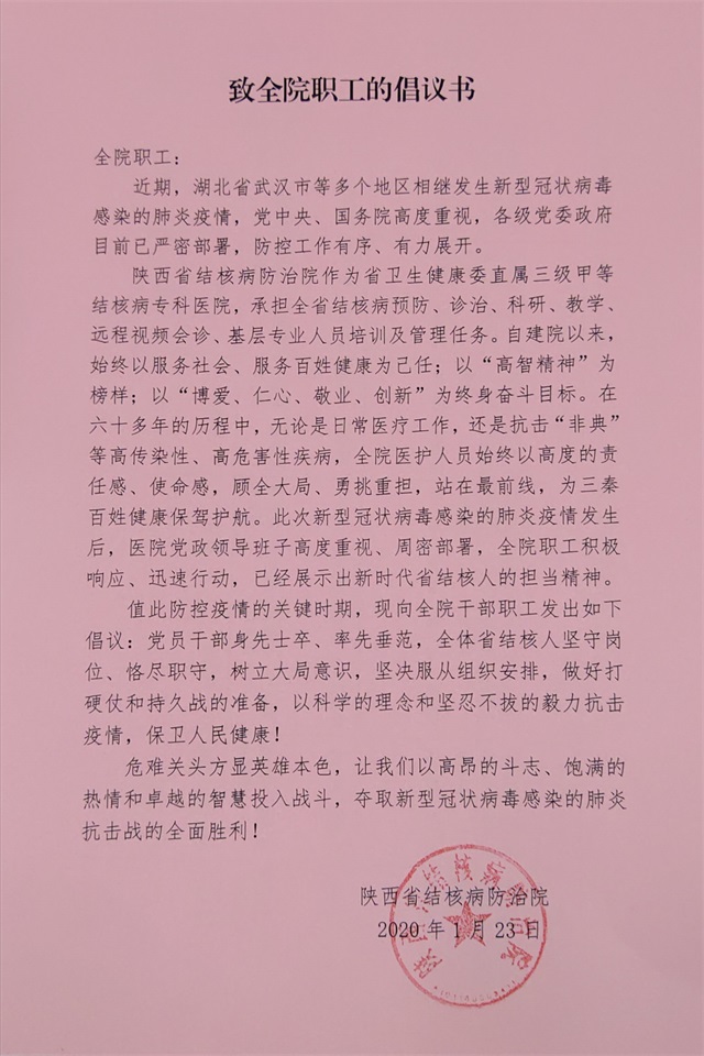 值此防控疫情的关键时期,现向全院干部职工发出如下倡议:党员干部身先士卒、率先垂范,全体省结核人坚守岗位、恪尽职守,树立大局意识,坚决服从组织安排,做好打硬仗和持久战的准备,以科学的理念和坚忍不拔的毅力抗击疫情,保卫人民健康!