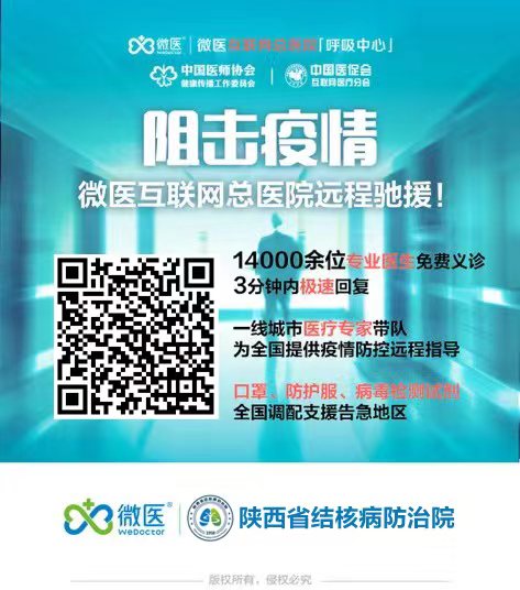 当前,新型冠状病毒疫情严峻,感染人数不断攀升,医院人满为患,前线医生不堪重负。为了缓解医院门诊压力,同时减少交叉感染,陕西省结核病防治医院联合微医互联网总医院开通“抗冠义诊”网络免费咨询服务模式,为这部分患者解决就诊需求,“医患不见面”的隔空问诊方式也符合卫生部门对于疫情防控的相关要求,减少传染疫情的风险,也降低了不必要的恐慌。欢迎您线上咨询、问诊。