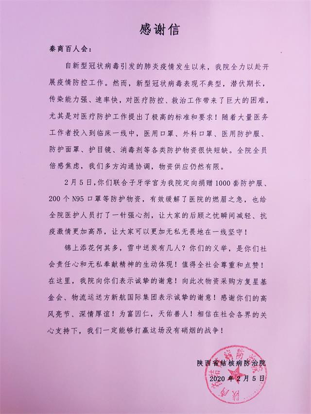 锦上添花何其多,雪中送炭有几人?你们的义举,是你们社会责任心和无私奉献精神的生动体现!值得全社会尊重和点赞!在这里,我院向你们表示诚挚的谢意!向此次物资采购方复星基金会、物流运送方新航国际集团表示诚挚的谢意!感谢你们的高风亮节、深情厚谊!为富因仁,天佑善人!相信在社会各界的关心支持下,我们一定能够打赢这场没有硝烟的战争!
