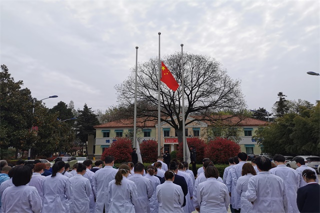 身着白衣,垂手肃立。上午10时整,升国旗降半旗仪式正式在我院行政楼门口举行,党委书记甘昭平带领职工干部集体庄严默哀3分钟,向在抗击疫情战争中牺牲的英雄和同胞们表达最崇高的敬意和最深切的缅怀。随后,医院三辆救护车和医院警用摩托车统一鸣笛,声音穿透长空,院内患者见之纷纷驻足,同步默哀。同时,为配合全国性哀悼活动,4月4日0时至24时,我院官网首页使用黑白页面。